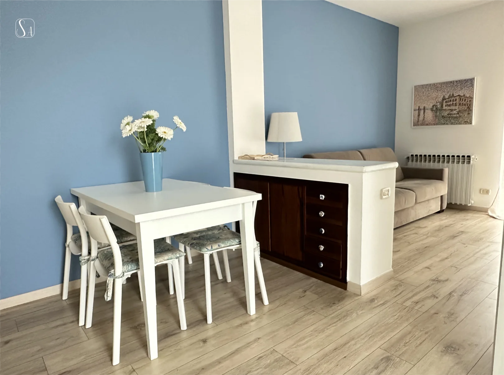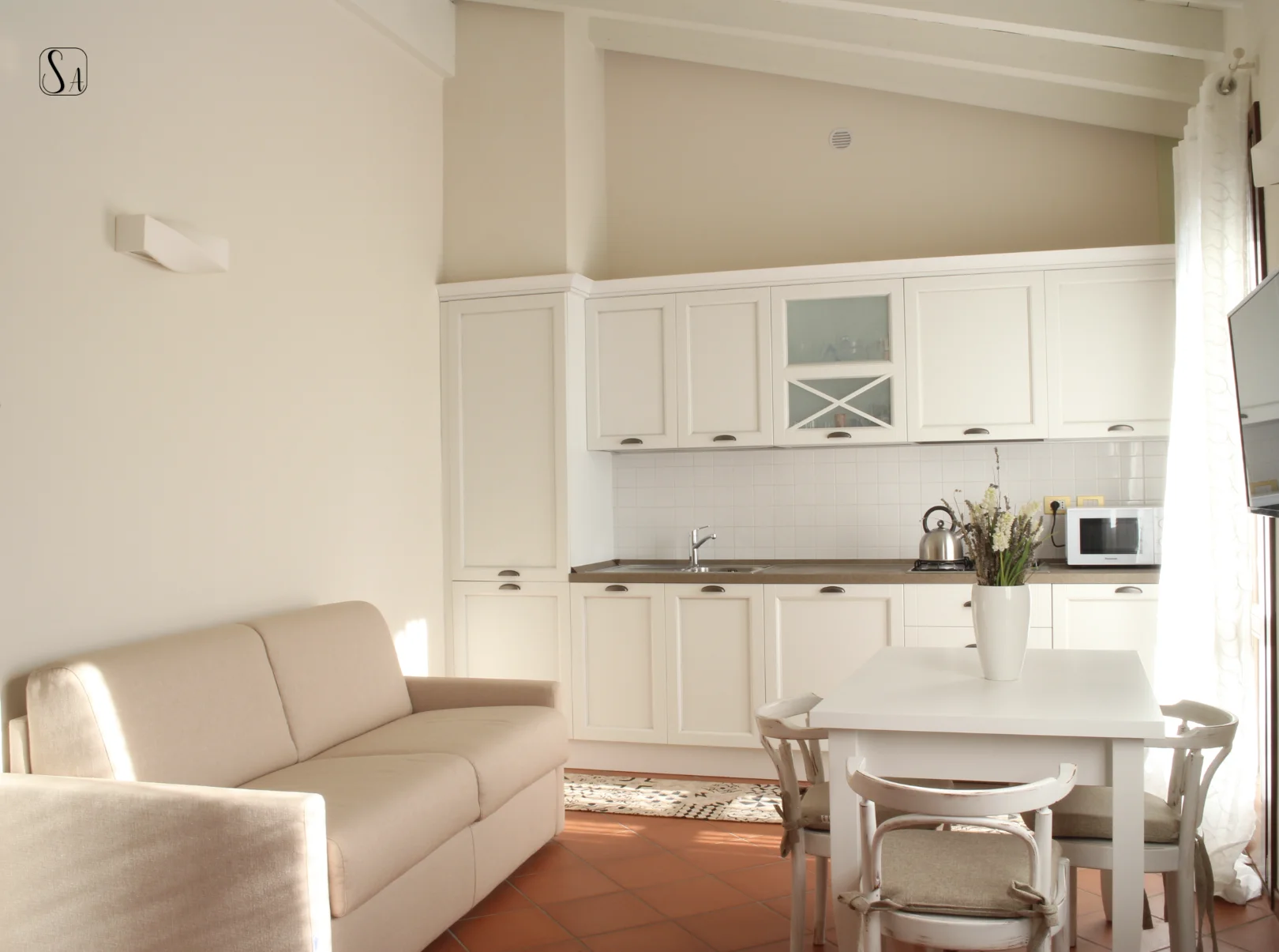 Attico trilocale libero su 4 lati situato a Sirmione, al secondo e ultimo piano di una piccola palazzina dotata di ascensore, finemente decorato, travi in legno a vista e parquet.